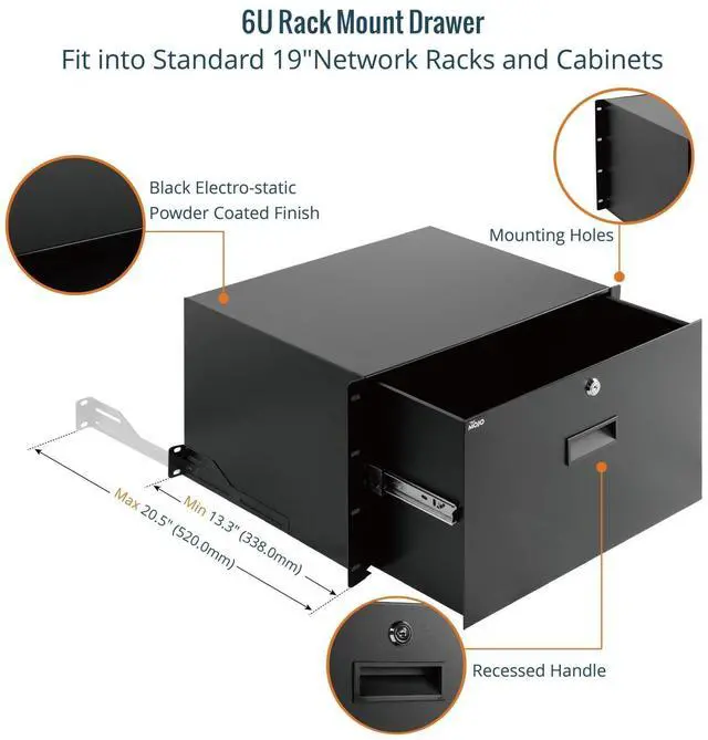 Durability & Strength: 6U rack mount drawer is made from heavy duty cold-rolled steel with an electrostatic powder-coated finish to resist rust and corrosion. Supports up to 22 lbs or 44 lbs with newly upgraded back supports. 13-inch inner depth provides ample storage space ^^