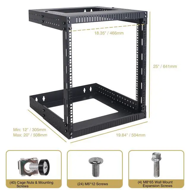 Better yet, the rack case is designed for wall mounting with rack-mount depth adjustable from 12" to 20" and accommodates a variety of 19" rack mountable PA, servers and network devices. Cage nuts and screws are included in the package for equipment mounting. A It is perfect for standard PA or IT equipment; amplifiers, microphone systems, crossovers, line switchers, servers, network devices, audio video equipment, and more!