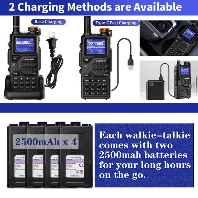 Extended Battery Life: One two way radio long range with two 2500 mAh rechargeable genuine batteries ensures long life for the baofeng triband radio, especially in emergencies or long time outdoor activities. Radios walkie talkies supports Type-C charging, you can charge baofeng ham radio on any USB port device. ^^ 3.