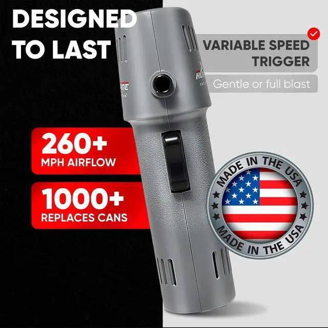 NEED A TURBO JET BLOWER MADE IN THE USA THAT BEATS CANNED AIR DUSTERS? This electric air duster delivers 260MPH of cordless compressed airthe ultimate upgrade from weak air can dusters for computers. A top-tier handheld blower for removing dust from PCs, laptops, cameras, Xbox, PS5, drones, electronics, and keyboards with no freeze, no pressure drop. ^^ CHOOSE YOUR SPEED - FROM GENTLE DUSTING TO POWER BLASTING! Use the variable-speed trigger to clean delicate electronics or blast crumbs and debris from car interiors. A versatile air blower gun and mini cordless turbo jet fan for barbers, gamers, tech pros, mechanics, and DIYers.