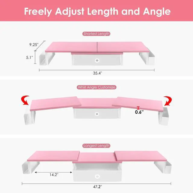 Sturdy Computer StandDual monitor riser with drawer is made of high quality MDF wood and solid steel legs. Desk shelf for monitor with metal feet can provide strong support and load-bearing. Non-slip rubber pads could prevent slipping or damage to your desk and it is a good desk organizer in pink for women. ^^ Large Storage SpaceMonitor riser for 2 monitors comes with a sliding drawer and two side caddies, which provide more storage space for your desk. The drawer could store personal items in privacy. One side caddies has divider that could store small office items, and the other side caddies is large enough to store file.