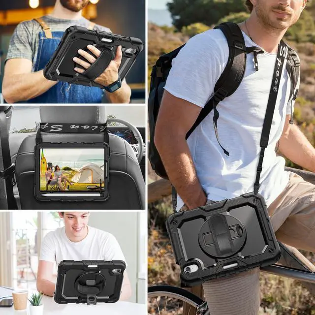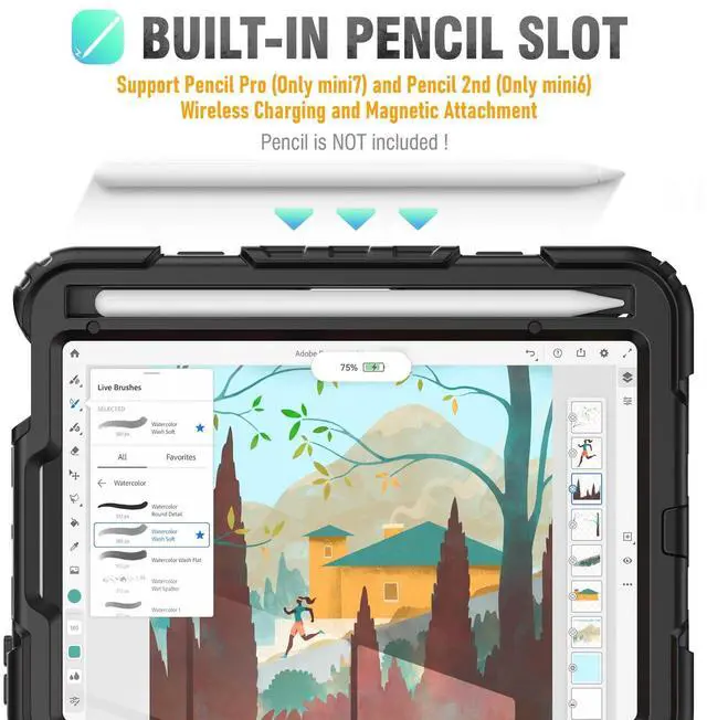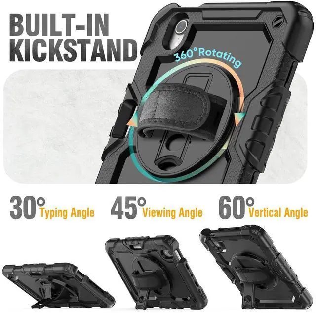 Number: A2993, A2995, A2996, A2567, A2568, A2569). The Pencil is NOT included! And you can find step by step install instruction video in our store. ^^ Shockproof+Screen Protector This case for iPad mini 7th (A17 pro) 2024 /6th 2021 is designed with durable anti shock material, soft silicone, hard plastic shell and built-in screen protector (2 front covers, one with built-in screen protector and one without). This sturdy mini 7&6 case can keep your pad safe from shock, drop, scratch or accidental damages in daily use. ^^ Rotating Hand Strap & Stand This mini 2024/2021 case provides a stable supports, with viewing/drawing/typing angles. You can hold the Pad safely by one hand and find the most comfortable viewing angle you need. also, the stand can be folded up when not in use. ^^ Multifunctional Carrying Strap Detachable and adjustable shoulder, both kids and adults can carry the 8.3 inch pad case during hiking, traveling or other activities outside, or hang it on the back of seat for fun when traveling in cars. ^^ Pencil Holder & Precise Cut-outs Allow easy access to all ports and buttons, the Pencil Slot Holder supports Pencil Pro (Only mini7) and Pencil 2nd (Only mini6) wireless charge and magnetic attachment, always keep your pencil secure in place, free take the mini 7/6th gen case around or put it in to a bag.