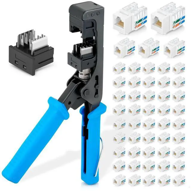 Bundle 3 Items: easyJACK - 90 Angled Speed Termination Tool + Replacement Head + of 90 Angled Cat6 Keystone Jacks in White (50 Pack)