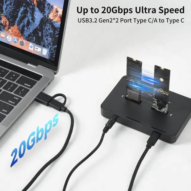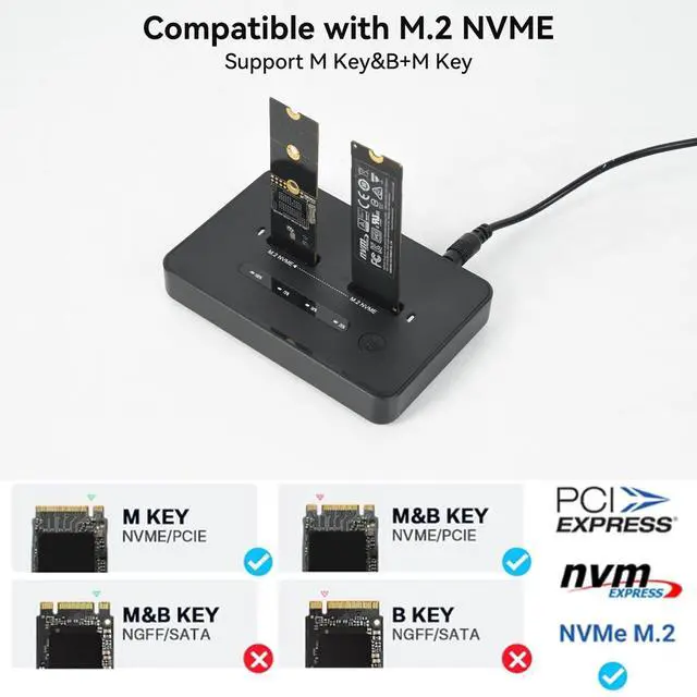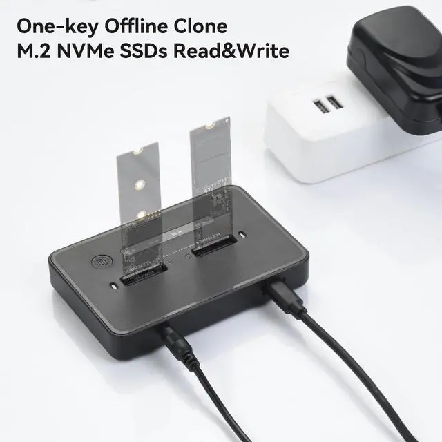 Note: NOT compatible with M. 2 SATA SSDs. ^^ Blazing-fast 20Gbps SpeedExperience lightning-fast transfers with up to 20Gbps speed via USB 3.2 Type-C interface. Making backups and file sharing effortless. Includes both USB-C to USB-C and USB-C to USB-A cables, so it works flawlessly with laptops, desktops, and more. Say goodbye to slow transfers and hello to ultra-efficient performance! ^^ One-Click SSD ClonerThe NVMe dock can be used as a standalone NVMe cloner, allowing you to clone hard drives with just the press of a button. No computer is required; the M. 2 duplicator is capable on its own.