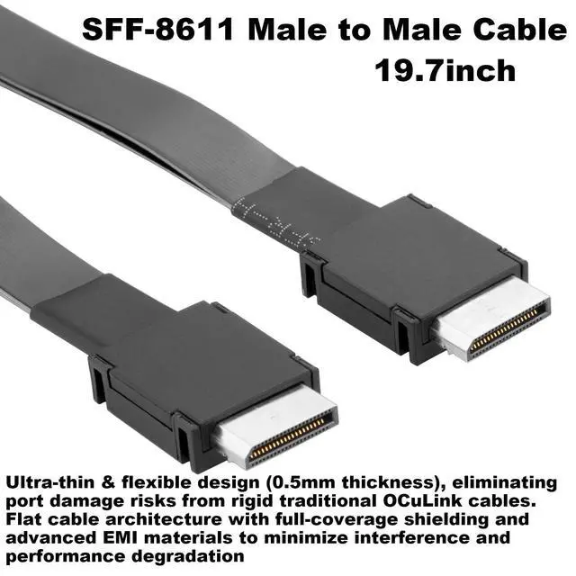 Male Cable: Ultra-thin & flexible design ( 0.5 mm thickness) with premium aesthetics, eliminating port damage risks from rigid traditional OCuLink cables. Flat cable architecture with full-coverage shielding and advanced EMI materials to minimize interference and performance degradation ^^