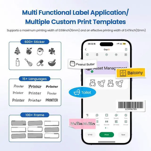 Long-lasting battery brings you a more efficient printing experience ^^ Inkless Label MakerThermal label maker machine with tape, eliminating the hassle of ink replacement. Mini label maker support label width up to 0.59 inch. For best performance, use with Label Tapes in 1/4, 3/8 and 1/2 widths available in various colors ^^ Multifunctional Label MakerPortable thermal labeler is support to print various texts, numbers, graphics, symbols, logos, barcodes, icons, tables, QR codes, images, timestamps, etc by Excel imports, scanning, OCR, and voice recognition.
