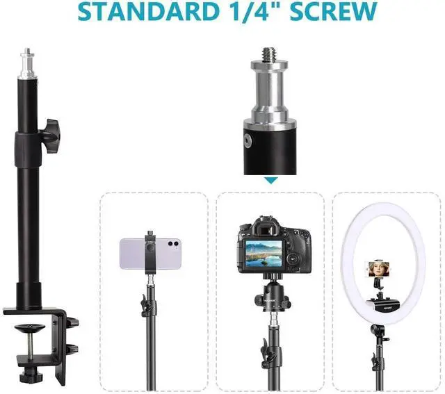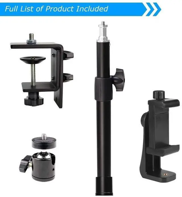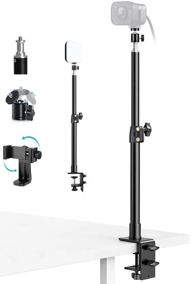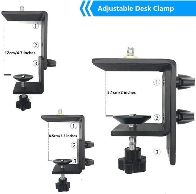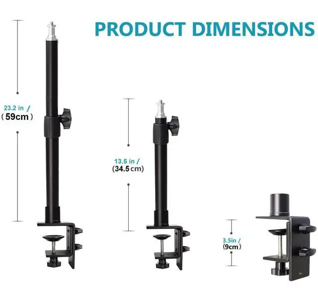 Webcam Desk Clamp Stand: height can be adjusted from 13.5 inches/ 34.5 centimeters to 23.2 inches/59centimeters through fixed knob; ^^