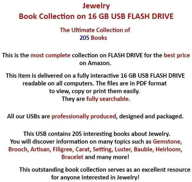 Jewelry Book Collection on 16 GB USB FLASH DRIVEThe Ultimate Collection of 205 BooksThis USB contains 205 interesting books about Jewelry. You will discover information on many topics such as Gemstone, Brooch, Artisan, Filigree, Carat, Setting, Luster, Bauble, Heirloom, Bracelet and many more! Many illustrations can be found and explored! This item is delivered on a fully interactive 16 GB USB FLASH DRIVE readable on all computers. The files are in PDF formatto view, copy or print them easily. They are fully searchable. All our USBs are professionally produced, designed and packaged.
