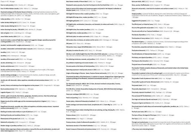 ----------------------------------A talk in jewels (1901) - Ryrie, J. - 45 pagesGold and silver jewelry and related objects (1924) - Williams, C. R. - 380 pagesOld English silver, jewellery (1931) - n. a. - 22 pagesThe jeweller's guide and handy reference book (1883) - Redman, W. - 108 pagesWatchmakers' and jewelers' practical receipt book; A workshop companion (1892) - Walker, C. E. - 136 pages+ Plus 200 more books!