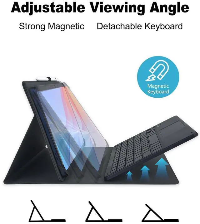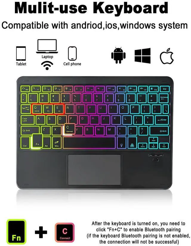 (Note: There is no camera hole in the shell, and automatic sleep/wake function is not supported) ^^ Rainbow Color BacklightThe keyboard can switch the backlight color freely, three colors can be displayed on the keyboard at the same time, and the breathing light mode can be adjusted, so you can use it easily in a dark environment ^^ Built-in TouchpadThe keyboard is equipped with a touchpad that supports multi-finger touch function, which can replace the mouse to operate the tablet, making it more convenient for you to use. The touchpad supports Android, Windows and IOS 13 (need to turn on assistive touch on iPad) ^^ PU Leather Material PU leather keyboard cover protects the tablet from the risk of daily damage such as impact, dust, scratches, etc. The magnetic buckle design can effectively prevent the tablet from falling off ^^ Removable and RechargeableThe keyboard can be taken out of the protective case anytime and anywhere without affecting normal use, suitable for various situations. The keyboard is equipped with a rechargeable battery and does not need to be connected to a power source. When it is out of power, Use Type-C charging cable to charge