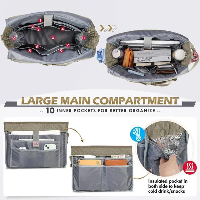 • LARGE CAPACITY & MULTIPLE STORAGE- The large main compartment of this teacher laptop bag with 10 inner pockets could easily hold all your daily necessities/college supplies/teaching materials/medical supplies in an organized way. The padded laptop compartment of this teacher tote bag offers optimal protection, which can fit in a 15.6" laptop and a 12.9" iPad. Insulated pockets on both sides are designed for snacks or coffee storage and keep cold or warm for hours