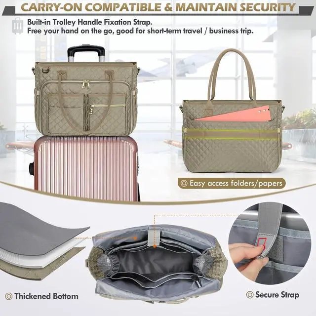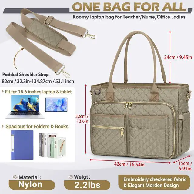 W x 12.6"H; weight: 2.2 lbs. Double layers of the front organized compartment aim to store scattered items. The front zip compartment features 4 elastic loops, one open pocket, and one mesh pocket, it's easy to stay organized with all of the different pockets. The 3 open pockets and a zip pocket in front offer easy access for items on hand. It also features a paper pocket in the back ^^ LONG LASTING MATERIALS- Made of durable water & scratch resistant polyester fabric, with smooth golden zippers, sturdy handle, and adjustable padded shoulder straps, nurse work bag prefect combination of stylish and functional. Reinforced stitching at each stress point ensures the laptop briefcase durability for long-term performance. High quality quilted teacher laptop tote bag aims to provide a sturdy and reliant user experience ^^ CONVENIENCE DESIGN FOR TRAVELERS- The luggage strap in the back allows this women tote bag to slide over the luggage tube, to free your hand on the go. The standard size of this women laptop bag makes this a good airplane travel bag, it is able to fit in the overhead bin and under seat space.
