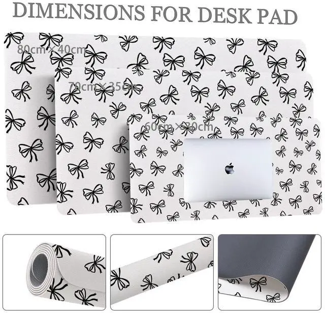 Package included: a 60 x 30 cm ( 23.6 11.8 inch) leather office home desk mat. This mouse pad is large enough to accommodate your laptop, keyboard, mouse and other desk items ^^ This desk pad made of durable PU leather, help prevent your desk from damages such as scratches, stains, spills and heat. And it is easy to clean, just wipe with a wet cloth or tissue ^^ No-slip particle design for back side increase friction resistance with the desktop. Smooth surface allows fast mouse movement while maintaining excellent accuracy and control ^^ This office home desk mat design with exquisite exclusive design patterns, it can decorate your home and office environment ^^ Unique cute kawaii black bow white leather desk mat design, it is a very creative and practical present for friends and family