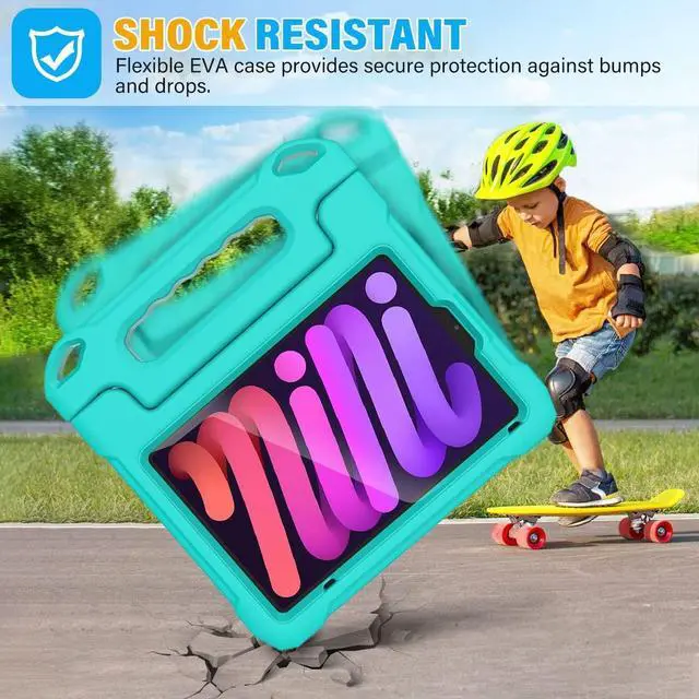 A15 Bionic 2021 (Model: A2567 A2568 A2569), NOT compatible with other iPad Mini model. ^^ Drop ProtectionMade of durable, child-safe, lightweight, wear-resistant, shock-absorbing and heavy duty EVA material, protects your ipad mini from accidental drops and bumps. ^^ Screen ProtetioniPad mini case extends toward the front and features a integrated screen protector, protects ipad screen from scratches and dirts without compromising sensitivity. ^^ Versatile StandBuilt-in a rotatable handle makes easy for kids to carry it around and allows you fold it back to convert into a sturdy stand for hands-free viewing and comfortable typing. ^^ Easy to UsePrecise cut-outs for buttons, ports and cameras, allows you easy access to all features without removing the case, also it is easy to install or remove the case.