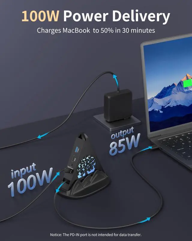 PD Charging: This USB-C hub for laptops supports up to 85W pass-through charging, with 15W reserved for USB peripherals. This enables fast chargingsuch as being able to charge MacBook to 50% in 30 minutesto keep your devices powered and ready during extended work sessions or multitaskingall powered by 100W Power Delivery.