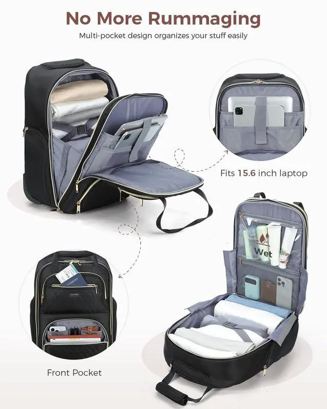 Spacious: Our rolling backpack has a large 30L capacity to hold all your essentials for 1-3 days; 4 compartments and 16 pockets, including a padded 15.6 inch laptop sleeve, suitable for both business and personal travel ^^
