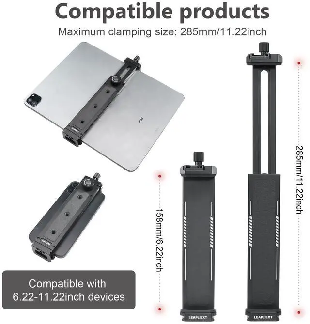 First to understand the material of the tablet clip, made of high-quality aluminum alloy, CNC machined from a double locking function, screw control and fine adjustment to ensure a secure and stable fit ^^ Scope of application, tripod universal tablet clip, suitable for all camera tripod and 1/4 universal ports on bottom and back, and equipped with an arca structure that allows quick installation to tripod stand. The top of the tablet has been left with a hot boot connector, so you can expand the accessories such as a fixture light, microphone and other accessories, and the level is equipped to be used as a parallel reference tool ^^ Compatible with iPad Pro 12.9, 10.5, 9.7, iPad Air, Air 2, iPad Mini 1, 2, 3, 4, Microsoft Surface 3 10.8, Surface Pro, Samsung Galaxy Tab A 7"/8"/ 9.7", Compatible with Samsung Galaxy Tab S3, 7-13" Tablet and more! ^^ Our 12 months warranty and friendly service, after sale service even closed in the return window.