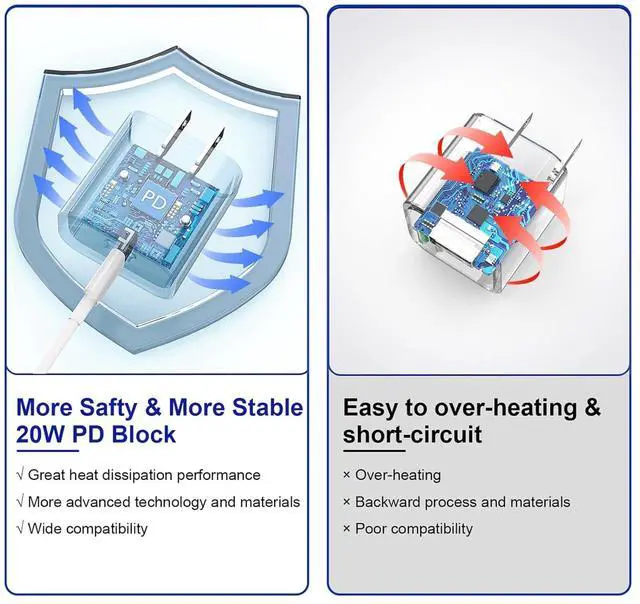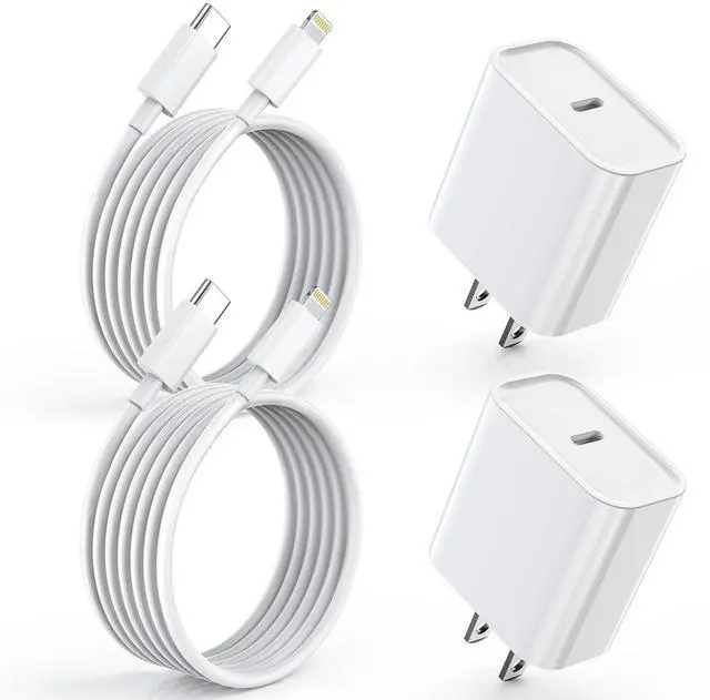 2 Pack iPhone fast charger + 2 Pack MFi Certified 3.3FT iPhone charging cable3X Faster iPhone Charging20W Fast Apple Charger charges iPhone 14 13 12 11 up to 50% in just 30 minutes. Compared with 5W original charger, this 20W PD fast charger for iPhone could save more than 1.5 hour for you! Apple chargers for iPhone automatically stops charging when battery capacity is full to ensure your device safety and long lifetime. 2 Pack Fast Charger iPhone MFi certified Lightning CableThe 3.3 foot apple fast charger Cable can support up to 2.4A. High quality lightning Cable is sturdy and durable enough to bear 30000+ bending and repeated unplugging.