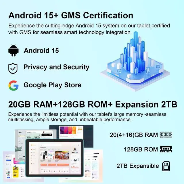 Android 15.0 Tablet CUPEISI tablet adopts the 2025 latest version of Android 15.0 system and has passed Google GMS certification, The android 15 tablets offer personalized security systems, lightning fast application launches, super smooth gaming, and stunning netflix multimedia experiences. ^^ 20GB RAM+128GB ROM+2TB Expandable Our CP31M android tablet PC built-in a powerful storage combination of 20GB RAM (4GB + 16GB achieved through expansion technology) and 128GB ROM, comes with new generation ultra-high performance and low power consumption 2.0GH z CPU, achieve faster and more stable running and storage speeds. In addition, it can be expanded up to 2TB with a microSD card (card not included) for even more storage.
