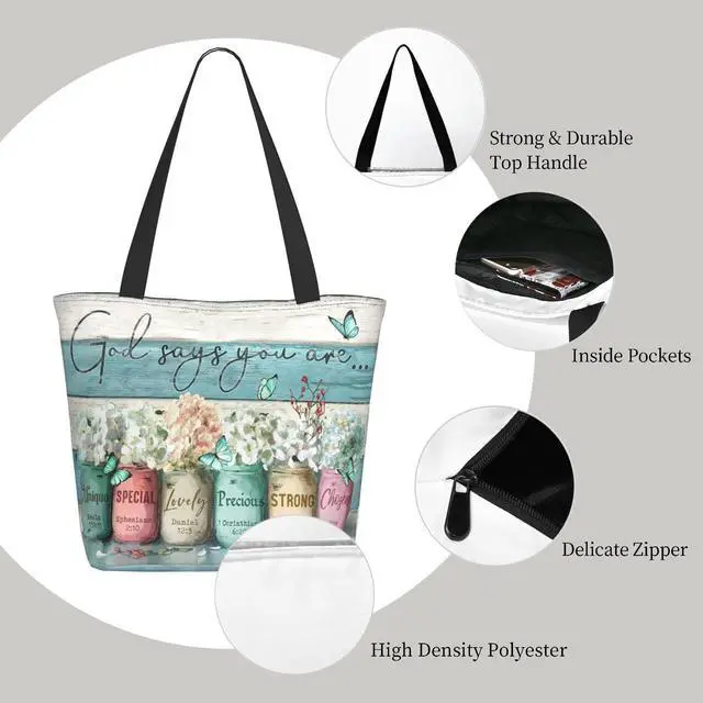 Faith-Inspired Floral Design: This tote features a serene flower-in-jar motif paired with the message "God Says You Are, " offering daily spiritual encouragement and elegance.