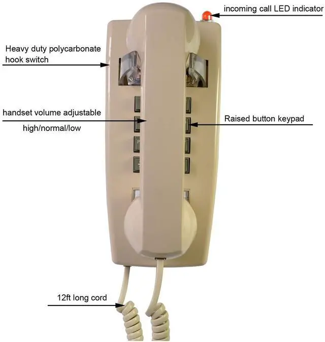 Functions IncludedRaised button keypad designed for repeated useMetal back panelTraditional bell ringerHandset volume controlHangs on a standard wall phone platePoly Carbonate Hook Switch for DurabilityWorks on any analog phone line (PSTN, VOIP) that is FSK or DTMF compatibleTelephone line poweredComes with wall plate for easy installation