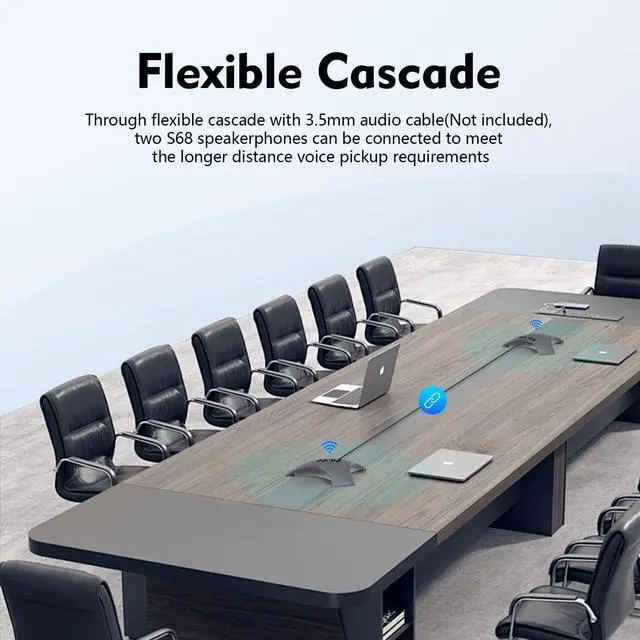 At the same time, we provide a USB A-C cable for devices that cannot connect wirelessly. ^^ Long Battery LifeBuilt-in 3000mAh battery, can support up to 10 hours of talk time, providing clear, smooth and stable audio and video experience. ^^ Supports Cascade and External Expansion MicrophoneWe also equipped it with ports for cascade and expansion microphones. You can cascade two S68 speakerphones by using a 3.5 mm audio cable (not included), or you can use an expansion microphone (not included) to achieve longer distance voice pickup.