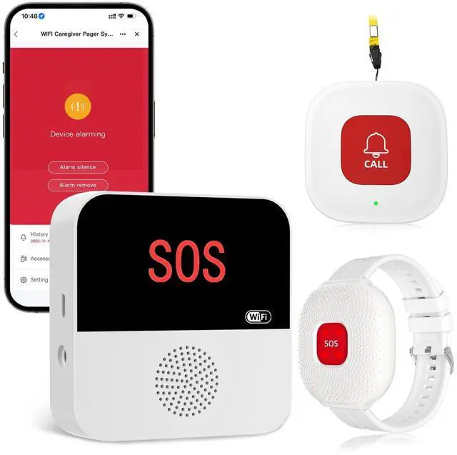 Reliable Caregiver Pager System: This upgraded Wi-Fi caregiver pager for elderly uses dual-channel protection. The 433MHz long-range signal (up to 328ft/100m) ensures the receiver alarms instantly even without Wi-Fi, while remote APP notifications allow caregivers to monitor seniors anytime, anywhere. Ideal life alert systems for seniors, disabled individuals, and home caregivers.