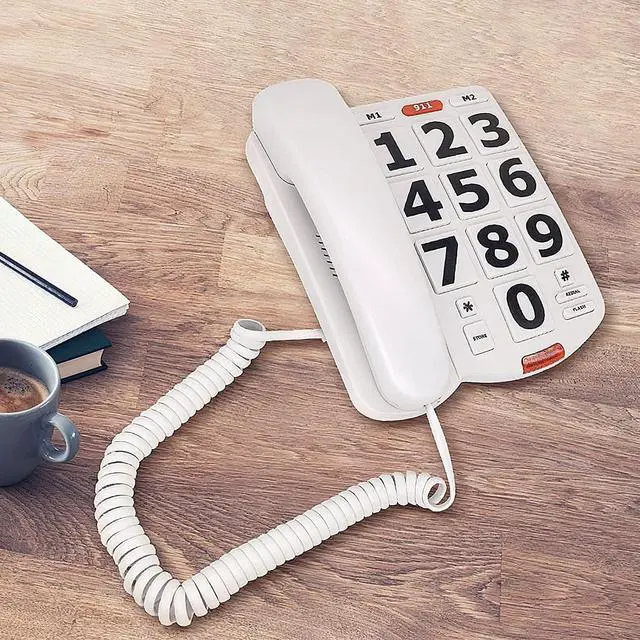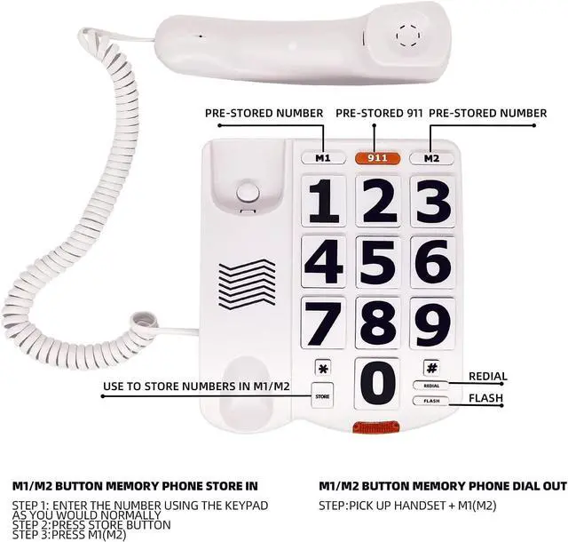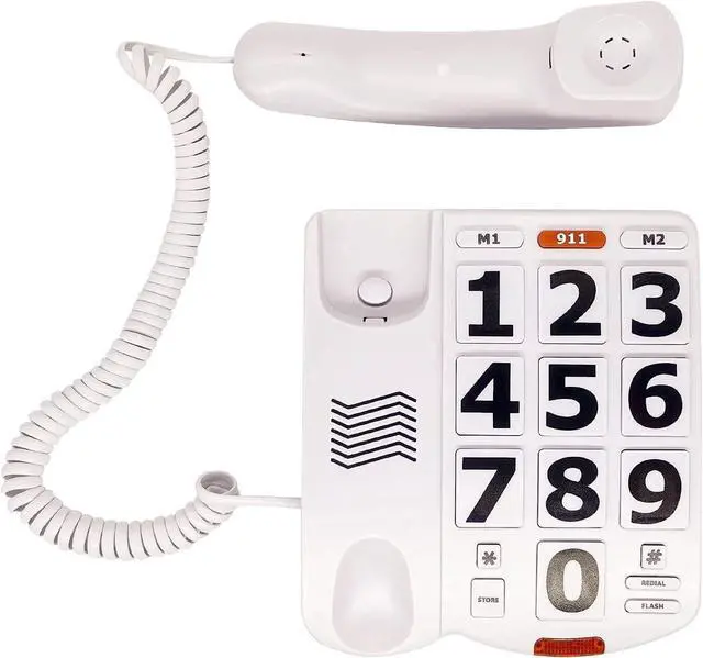 Introducing the Big Button Phone for Seniors, a landline telephone designed with accessibility in mind. This phone features 9 large, pictured buttons that can store one-touch speed dial numbers, allowing for easy communication with loved ones. The volume is adjustable, with a ringer that can be set from low to high and a sound on the handle that can be set to low, medium, or high, providing flexibility for various environments. The handset offers high-definition hands-free functionality, allowing for clear conversations without needing to hold the phone to your ear.
