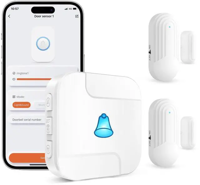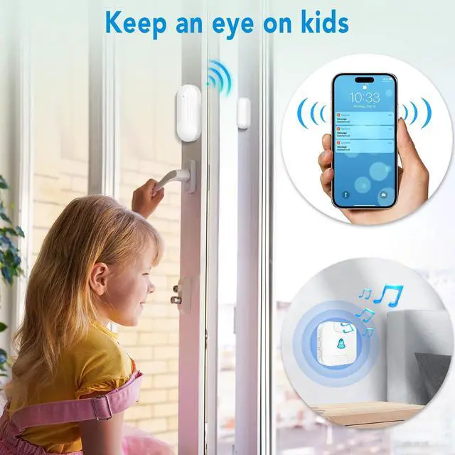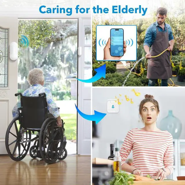 Smart Wireless Door AlarmYou can set up the wireless doorbell receiver through your smartphone, including setting the music melody, sound level, and setting different chimes and names for different transmitters. When the elderly or children open the door and go out, the gateway (plug-in receiver) will send out an alarm, and at the same time, the smartphone app will receive a warning alert, you will receive cell phone notifications from anywhere to ensure your family's safety. ^^ Works with TuyaDownload the tuya app, connect your device to the app over a 2.4 GHz Wi-Fi network (not compatible with 5 GHz) and start protecting your home.