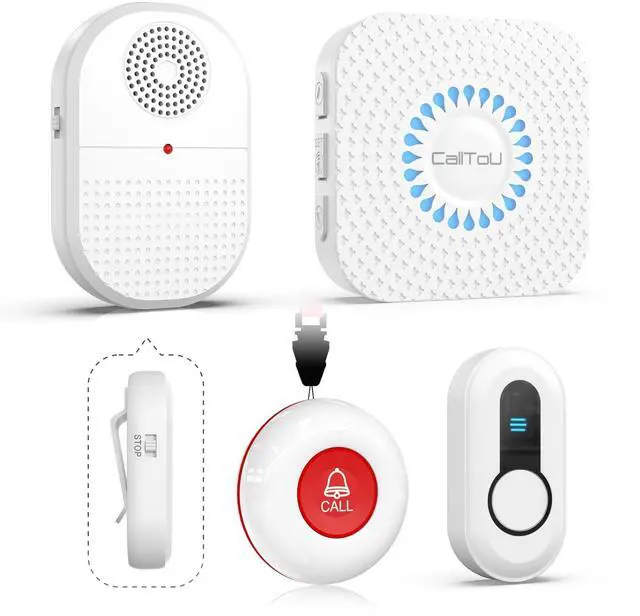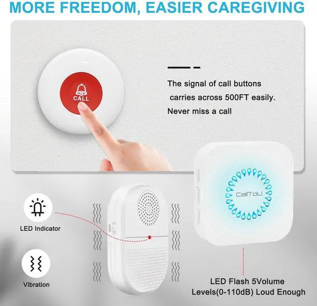 Saves Hovering Over A Loved OneCaregiver pager's receiver is battery-powered and portable with belt clip, and the working range is up 1000FT in barrier-free place, you can work out in the yard, do housework or work at home freely. Gives you peace of mind and protect your loved one's independence and privacy ^^ A Huge Help for Hard of Hearing CaregiversThe receiver of the emergency call button system is with vibrate, LED light and ringtone function, which is durable for the hearing loss. It has 5 volume level (0-110dB), loud enough and vibrates great that can wake a sleeping caregiver, so can avoid miss a call.
