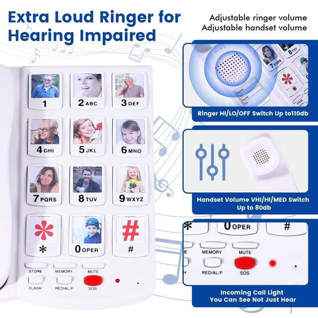 Easy Connection: This landline phones for seniors comes with 10 one-touch memory keys, allowing you to store frequently dialed numbers and attach a photo to each for easy recognition. Whether it's family, friends, or emergency contacts, these speed dial keys ensure quick and easy dialing. In addition, another SOS function provides extra safety, making it easier for seniors, Alzheimer's patients, or anyone who needs fast access to important contacts ^^ Hearing-Impaired Friendly with
