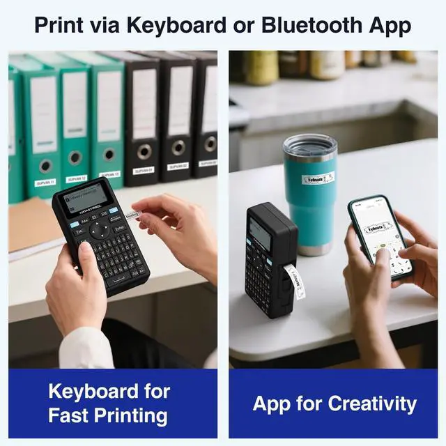 Fast Keyboard & Smart App Printing: Print directly via the keyboard for quick frequent labeling, or use the Bluetooth App to create customized designs; ideal for home organization, garage tools, pantry items, office files, and school supplies ^^ Portable with