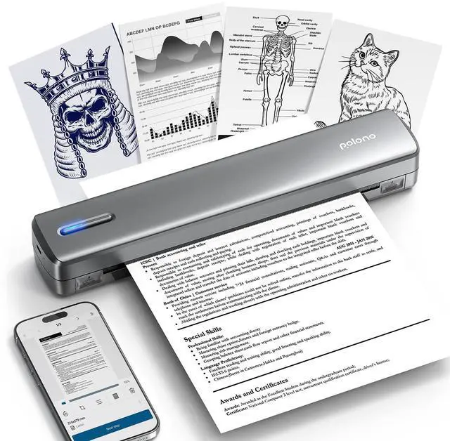 POLONO Portable Printer Wireless for Travel, D810 Bluetooth Thermal Printer Support for 8.5" x11" US Letter, Inkless Printer Compatible with iOS, Android, Laptop for Office, Car and Home, Sliver