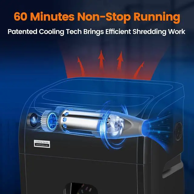 Continuous Working: Equipped with advanced patented cooling system, this shredder features extra fast shredding speed with 60 minutes continuous running. For safety concern, if it keeps shredding over its maximum working time, shredder will be overheating. After 60 minutes cooling cycle, it can work normally. Also equipped with auto thermal protection and FIVE LED indicators for safe operation ^^ P-4 Higher