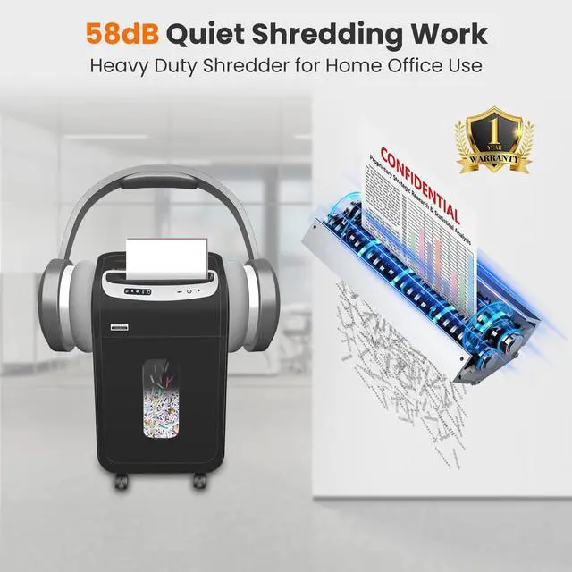 Quiet Shredding: 58 dB low noise creates the quiet and comfortable atmosphere. This paper shredder has 1-Year limited protection. SEVERAL small paper particles might be left in the basket due to full quality test by the manufacturer ^^