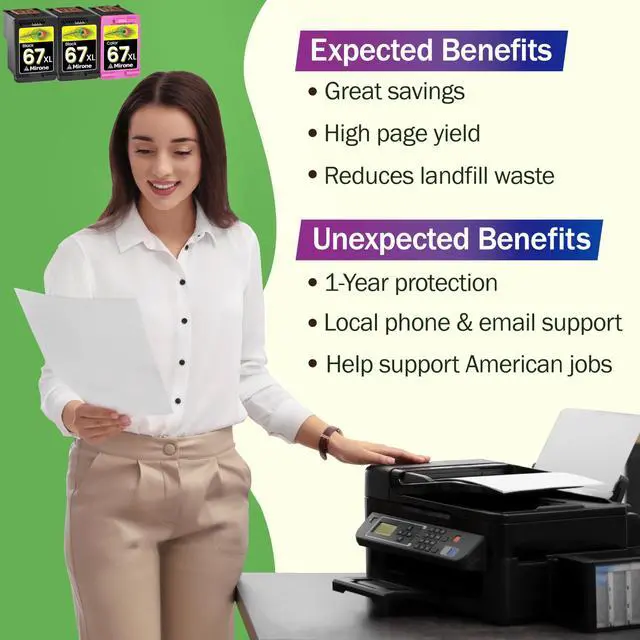 Great quality and service. Our cartridges go through strict quality testing for print reliability, quality, and yield. You also get access to lifetime phone and email support (available on packaging), as well as a 1-year warranty. ^^ Contents. 3 remanufactured for HP Ink 67 cartridges (2 black, 1 color). ^^ Compatible with