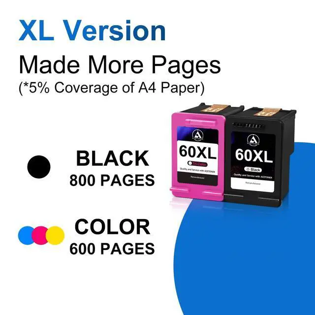 High Page Yield: Up to 800 pages per 60XL black ink cartridge and 600 pages per 60XL color ink cartridge5% coverage ^^ What You cna