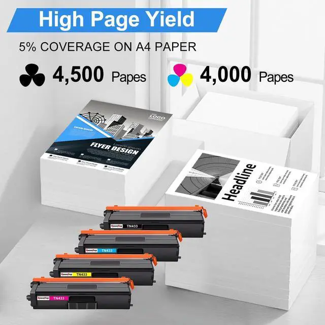 Page Yield: Up to 5500 pages per Black TN433 Toner cartridge and is 5000 Pages per Color TN433 Toner cartridge at 5% coverage (Letter/A4) ^^