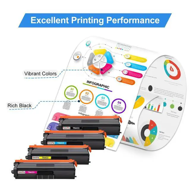 Package Contents: 1 x User Guide, 1 x Black TN433 Toner cartridge, 1 x Cyan TN433 Toner cartridge, 1 x Magenta TN433 Toner cartridge, 1 x Yellow TN433 Toner cartridge (Total 4 Pack).