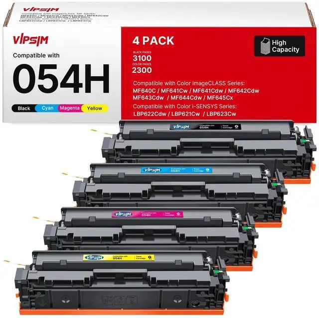 • Package Contents: 4 Pack 054H toner replacement for Canon 054 toner cartridge set, including 1 X 054H Black Toner Cartridge, 1 X 054H Cyan Toner Cartridge, 1 X 054H Magenta Toner Cartridge, 1 X 054H Yellow Toner Cartridge and 1 X User Guide