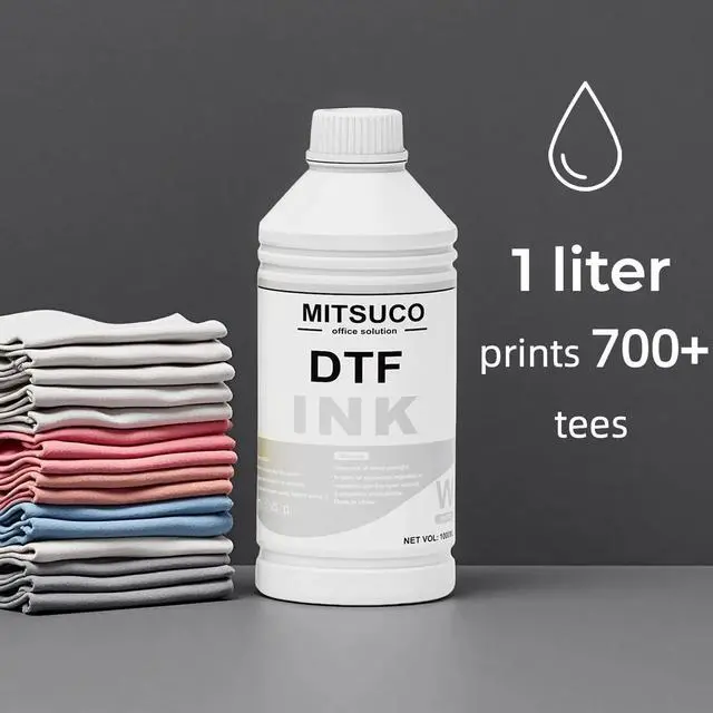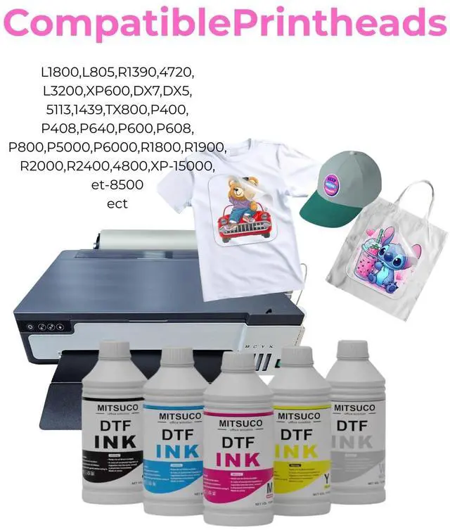 Compatible printheads: et-8550, L1800, L805, R1390, 4720, I3200, XP600, DX7, DX5, 5113, 1430, TX800, P400, P408, P640, P600, P608, P800, P5000, P6000, R1800, R1900, R2000, R2400, 4800, 4880, 4900, 7880, 7890, R3000, R3880, F2000, F2100, F2200, P700, P900, XP-15000, etc. ^^ Versatile ApplicationsMitsuco DTF ink is ideal for creating personalized items such as T-shirts, festival clothing, and home decor. It adheres well to a variety of fabrics, including cotton, polyester, linen, nylon, and blends, as long as they are suitable for heat pressing. Common applications include T-shirts, denim, hoodies, curtains, bedding, and more ^^