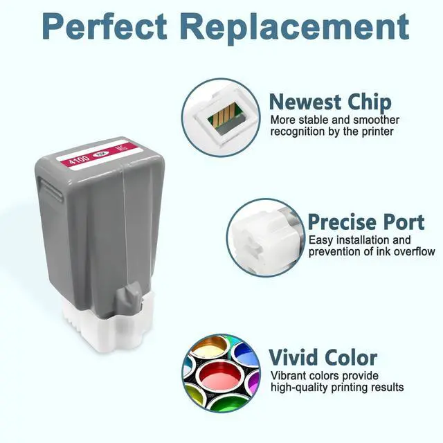 Superior Quality: This high-yield PFI 4100 ink cartridge uses the latest chip technology and high-quality pigment ink, with an anti clogging nozzle design and easy installation. Provide clear text and graphics ^^