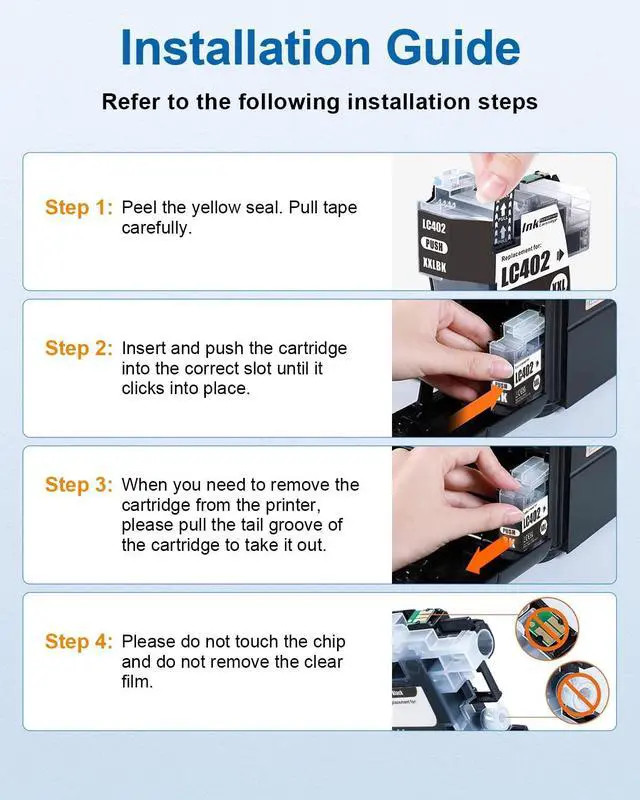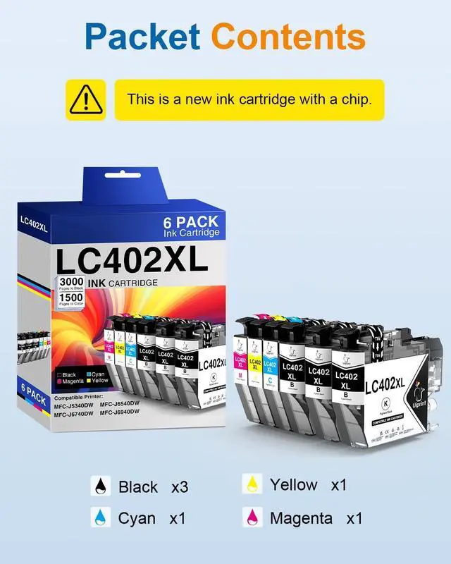 Model Number: LC402XL ink cartridges is equipped with the latest upgraded chips. Replacement for brother lc402 lc402xl ink cartridges ^^ Excellent PerformancePremium Quality LC402XL ink cartridge provides rich black and vivid color. Easy to install, not leak, not clog, not fade, long-lasting print. Premium performance fulfills all the home, school, or office printing needs