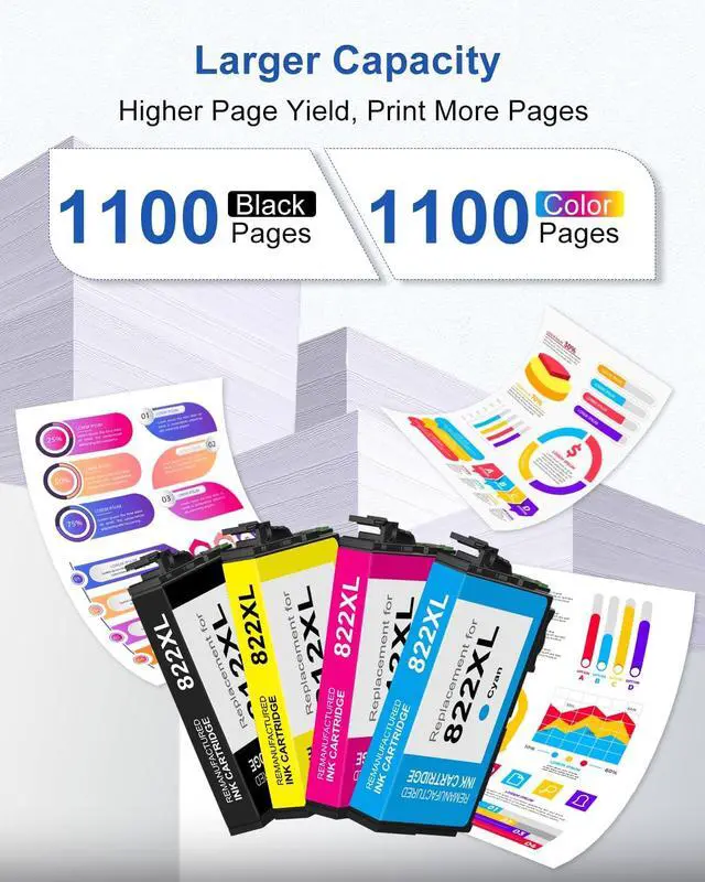 Replacement for 822xl printer ink epson Printing Capacity: 1100 pages with each 822XL Black ink; 1100 pages with each 822XL Color ink (depends on printer and usage)