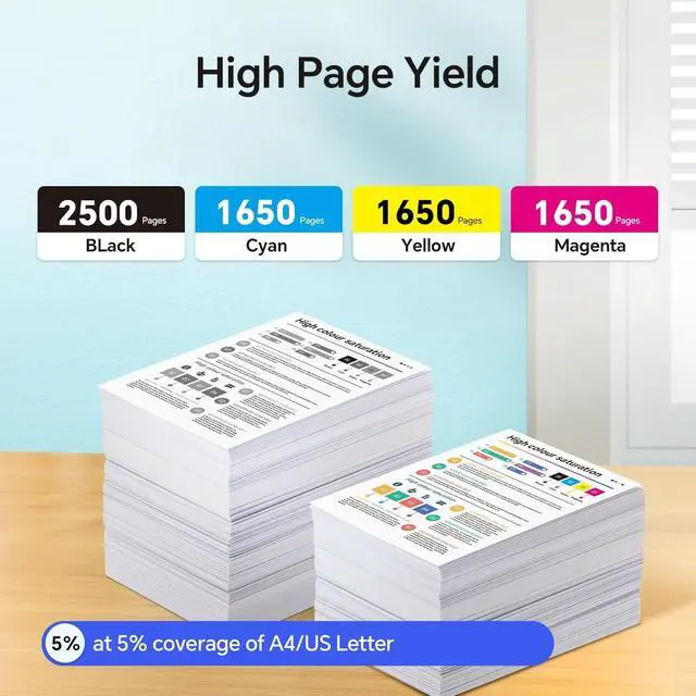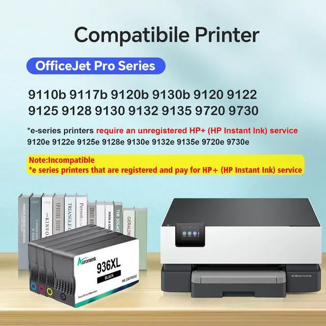 Package Contents - 936XL ink cartridges compatible with HP 936XL ink cartridges combo pack (1 * 936XL Black, 1 * 936XL Cyan, 1 * 936XL Magenta, 1 * 936XL Yellow ink cartridge) ^^ Compatible Printers - 936XL ink cartridges compatible with OfficeJet Pro 9110b 9117b 9120b 9130b 9125 9730 9120 9135 9130 9122 9128 9132 9720 Series printer ^^ Important Notice - 936XL black and color combo pack is not compatible with *e series printers that are registered and paying for HP+ (HP Instant Ink) service ^^ High Page Yield - Each 936XL black ink can print up to 2, 500 pages, and each 936XL color ink can print up to 1, 650 pages (At 5% coverage A4 / letter size) ^^