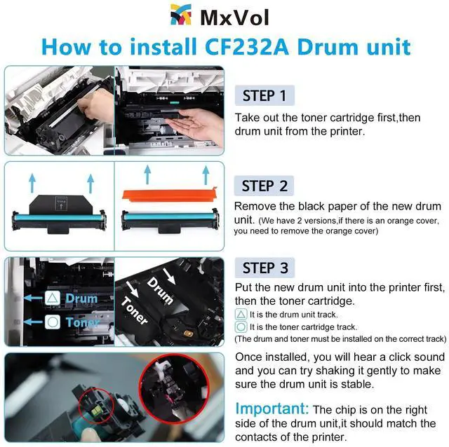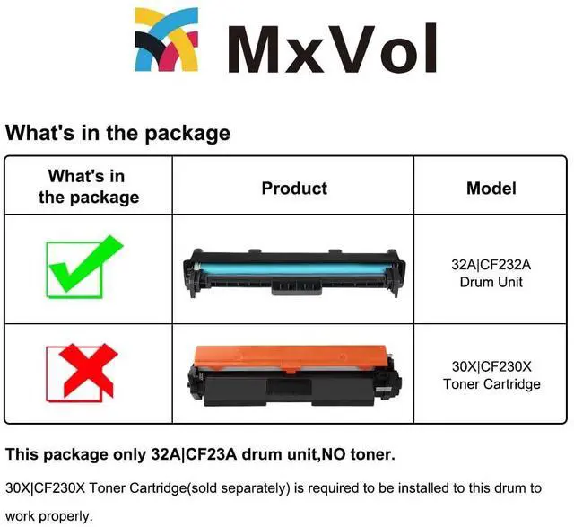 Note: The item is only the CF232A drum unit(2-Pack), not contain toner. You need to use with CF230A CF230X or CF294A CF294X toner cartridge. ^^ Compatible Printer - 100% Compatible with HP Laser jet Pro M203dw M203dn M203d MFP M227fdw M227fdn M227sdn; M148dw M118dw M148fdw; Ultra M206 Ultra MFP M230fdw M230sdn Printer Series. ^^ Lifetime Warranty - Meticulous care is offered for any problems regarding your order, even if refund window is close. Always stand by for your needs. ^^ Quality Assurance - All cartridges are built to be environmental friendly and manufactured in compliance with ISO 9001 and ISO 14001, tested to be qualified for premium performance. Consistently deliver standout results throughout the cartridge life. Ensure your printing is perfect at the first time and every time with MxVol printer toner.
