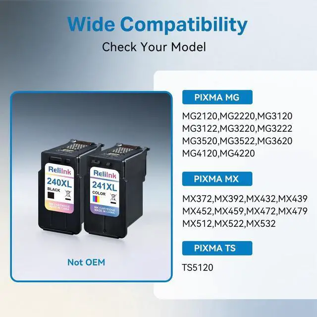 Wide Printer Compatibility: ReliInk 240 241 ink cartridges for canon printers are perfectly compatible with various canon pixma printer, including Pixma MG3620, TS5120, MG2120, MG2220, MG3120, MG3122, MG3220, MG3520, MG4120, MG4220, MX372, MX392, MX432, MX439, MX452, MX459, MX472, MX522, MX532. Whether youre printing at home, in a small business, or for school projects, this ink for canon 240 and 241 ink cartridges deliver consistent quality and smooth operation with zero compatibility worries.