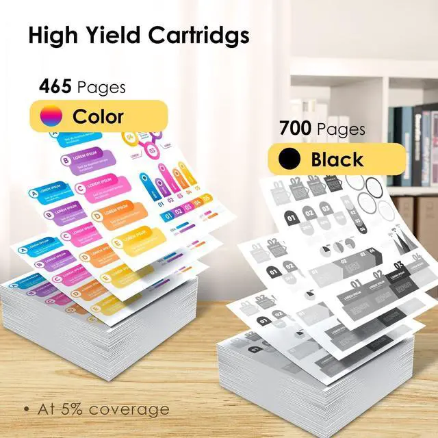 Ink Contains: Remanufactured for hp 64xl ink cartridge combo pack, including replacement for hp 64 ink cartridges black*1 and replacement for hp 64 ink cartridges color*1 for hp printers. Replacement for hp 64 ink cartridges black/color combo pack are well packaged to prevent ink leakage. Strictly quality testing before delivering for a better printing experience ^^ High Page Yield Remanufactured for 64XL