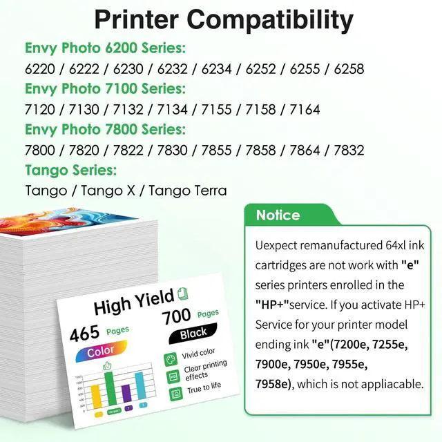 Ink: Compatible for HP Envy Photo 7855 printers, remanufactured for 64xl ink cartridges combo pack replacement for hp printers delivers high capacity printing performance. remanufactured for 64xl black ink cartridge up to 700 pages, remanufactured for 64xl color ink cartridges up to 465 pages (64xl ink cartridges at 5% coverage on A4 paper ^^ Remanufactured for 64XL