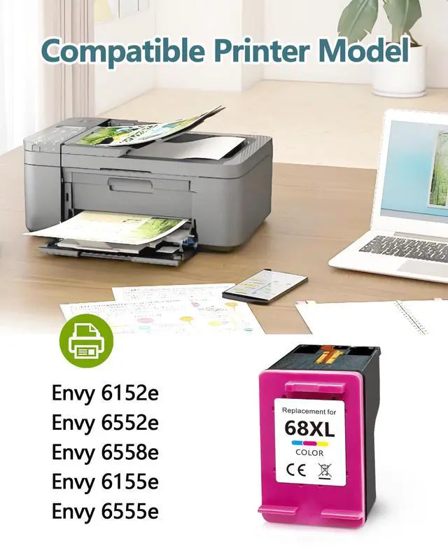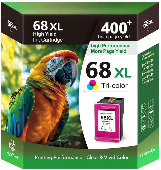 Package Contents: 1 68 color Ink Cartridge. ^^ 68 ink cartridges work with: Works perfectly with Envy 6155e, 6555e, 6152e, 6558e, and 6552e printers, delivering consistent quality prints every time. ^^ 68 ink cartridges yield: Enjoy extended printing with 68XL ink cartridges: color delivers up to 400 pages, efficient use.